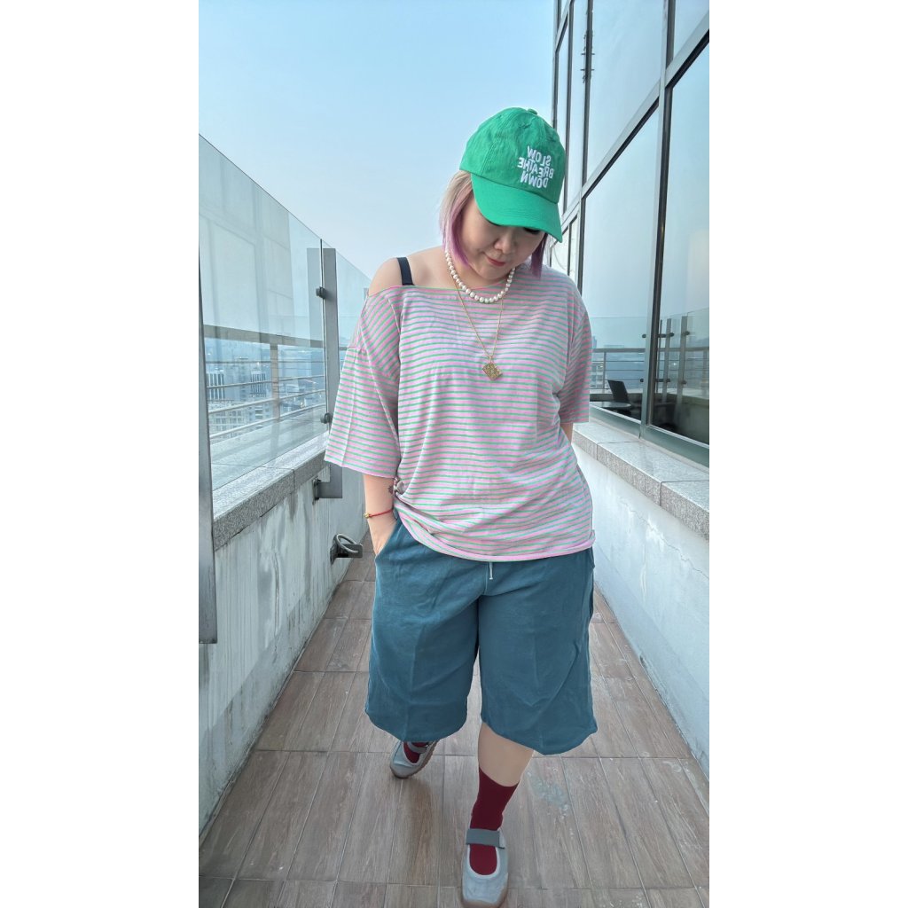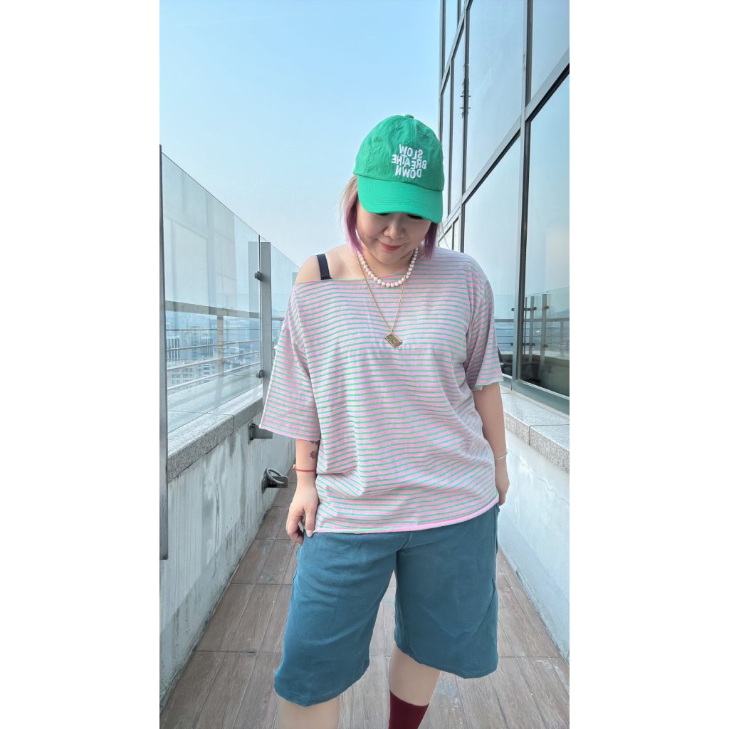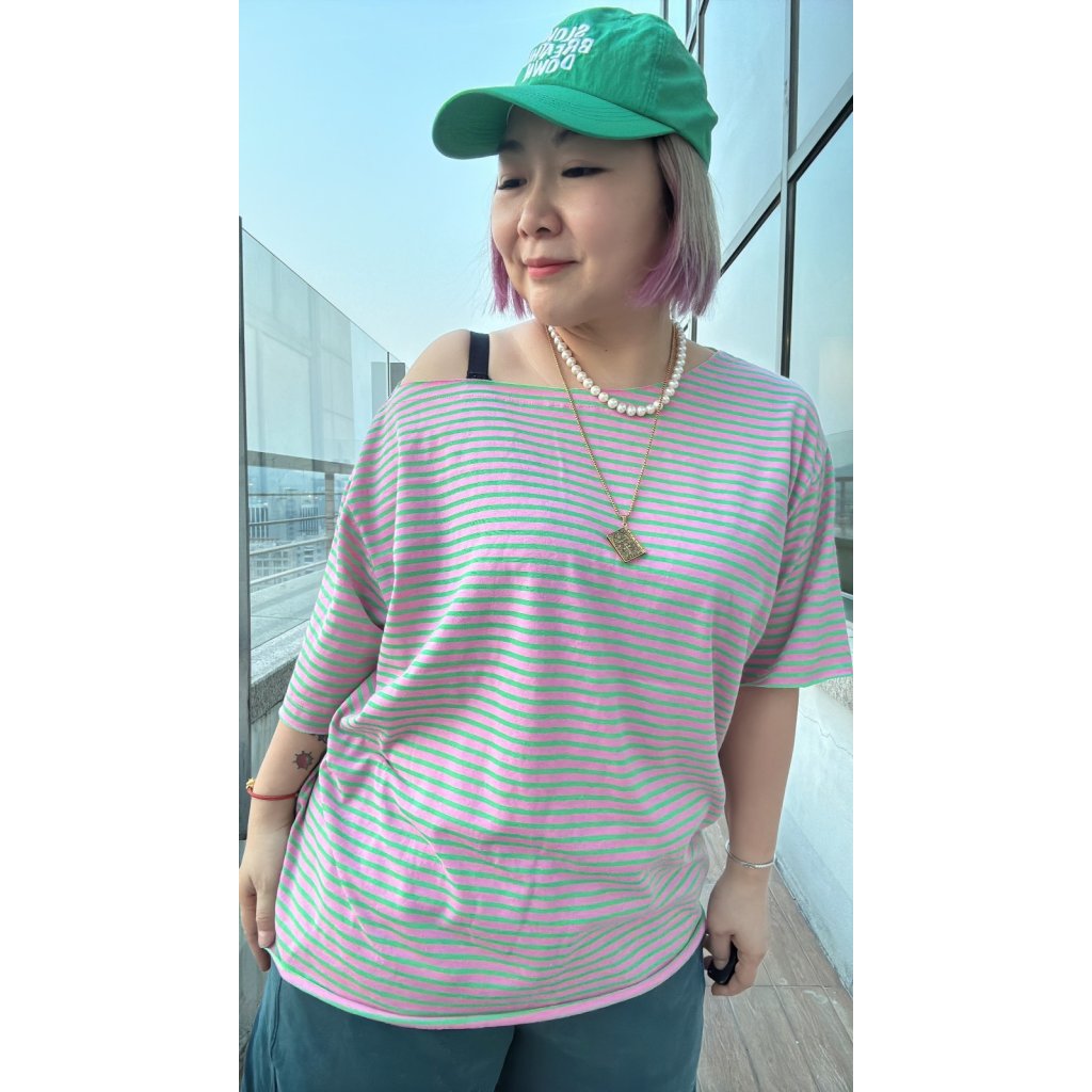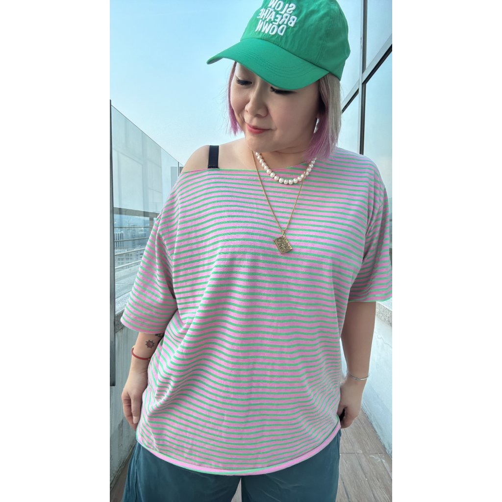T-6115 粉紅綠間斜膊Tee